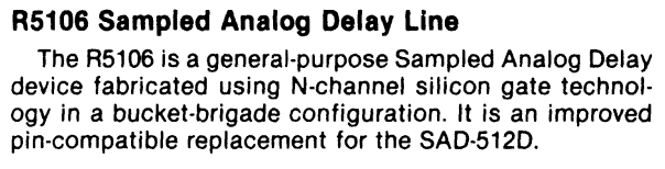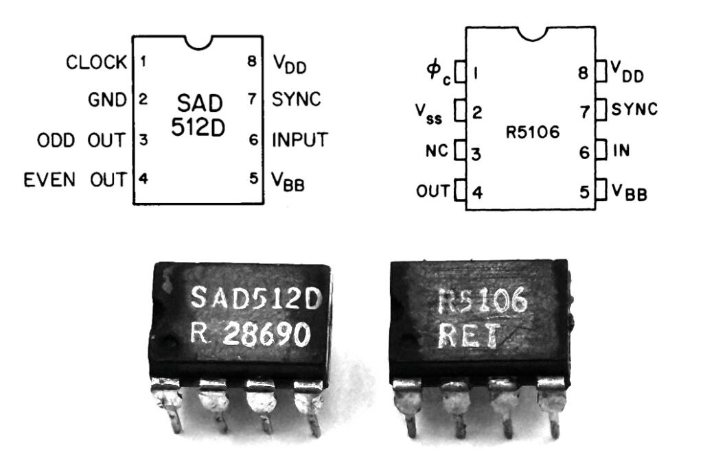According to the datasheet of the Reticon R5106 BBD, this chip “is an improved pin-compatible replacement for the SAD512D (do not confuse with the 16pin SAD512)”. The datasheet of the newer RD5106A doesn’t mention this compatibility. I was curious to know if they were interchangeable.