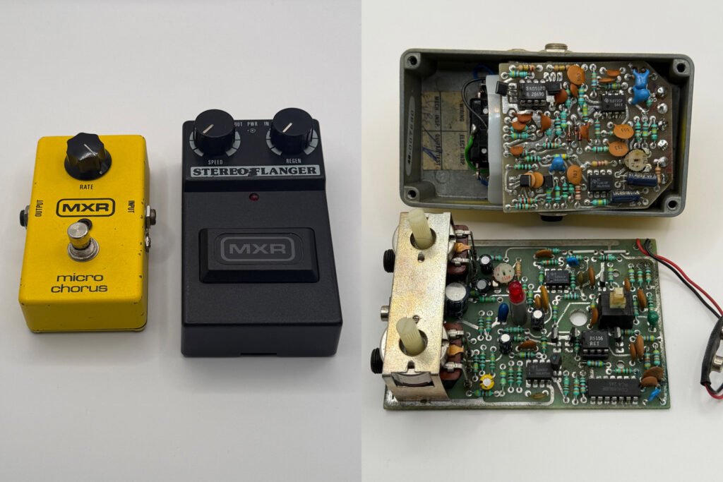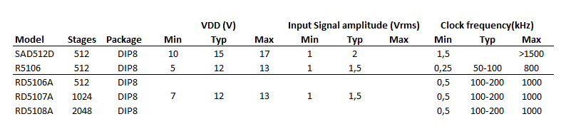 It took some time to find devices that use these chips. I eventually bought a MXR Micro Chorus with a SAD512D and a MXR Stereo Flanger with a R5106.